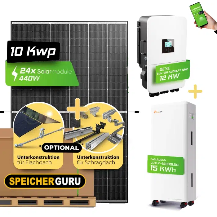 Das 10,56 kWp Photovoltaik-Komplettset bietet eine leistungsstarke und ästhetisch ansprechende Lösung für nachhaltige Energie. Ausgestattet mit 24 JA Solar 440W JAM54D41 LB All Black Modulen, einem Deye SUN-12K-SG04LP3-EU 12 kW Hybridwechselrichter und einem Felicity LUX-Y-48300LG01 15 kWh Batteriespeicher, garantiert dieses System höchste Effizienz und Zuverlässigkeit für Haushalte und Unternehmen.