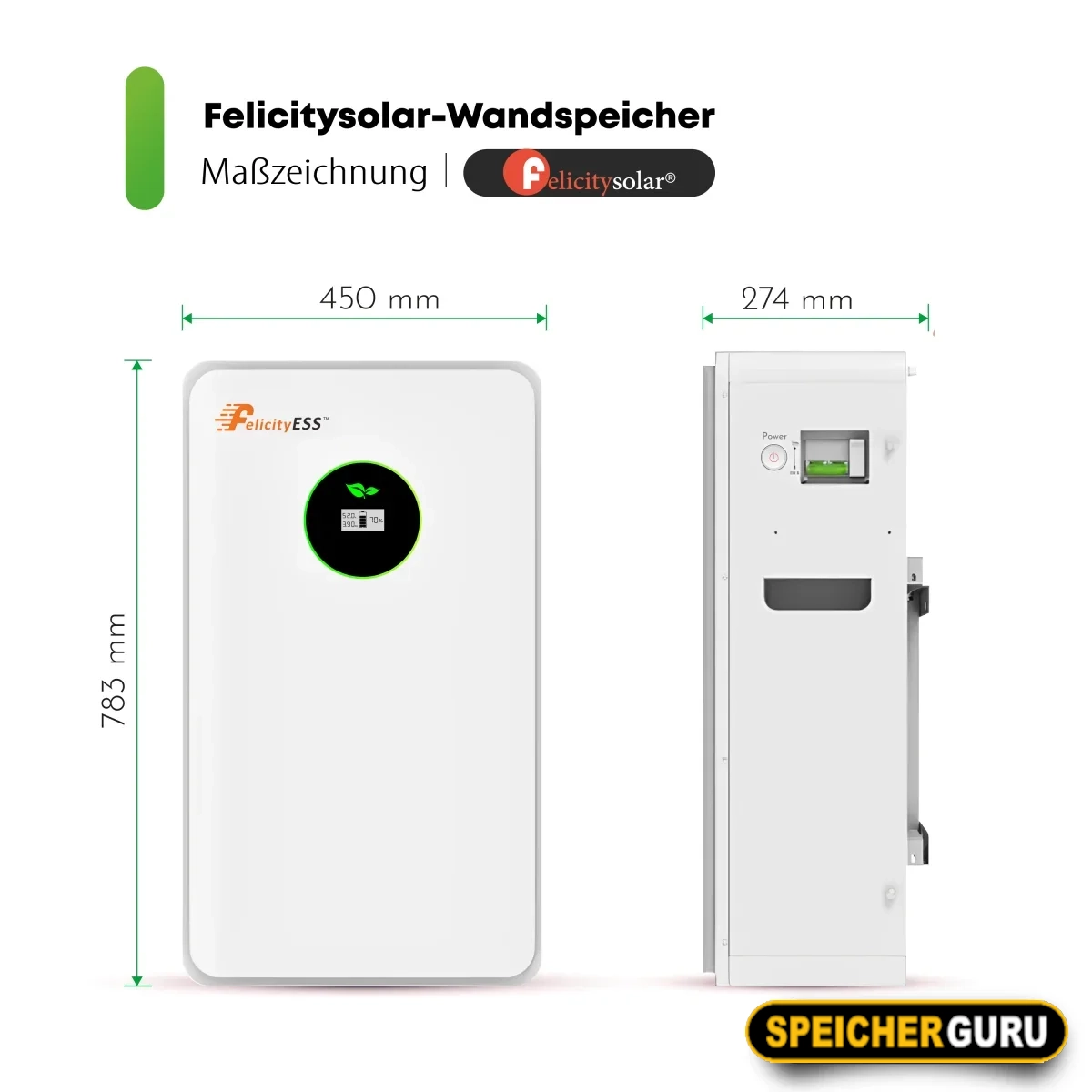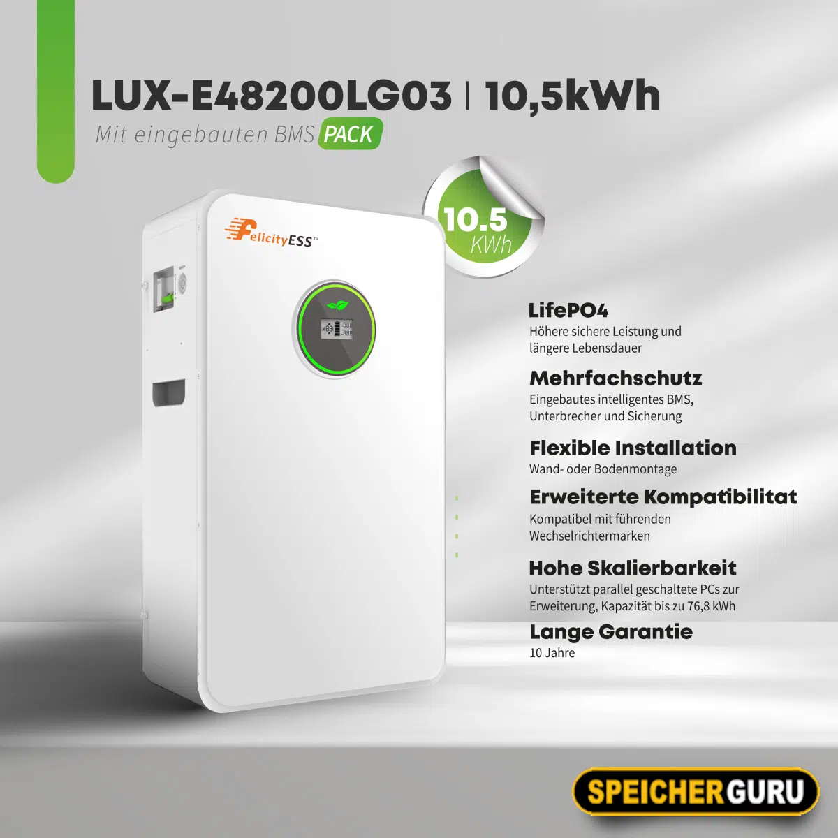 Der Felicity 10,5kWh ESS LUX-E-48200LG03 Wandspeicher ist eine exzellente Lösung zur Optimierung Ihrer Solaranlage und Steigerung der Eigenverbrauchsquote. In Deutschland sind Strompreise hoch, während die Einspeisevergütung gering ist. Ein Batteriespeicher ermöglicht es Ihnen, überschüssigen Solarstrom zu speichern und dann zu nutzen, wenn die Sonne nicht scheint – so sparen Sie bares Geld und machen sich unabhängiger von externen Energieversorgern.