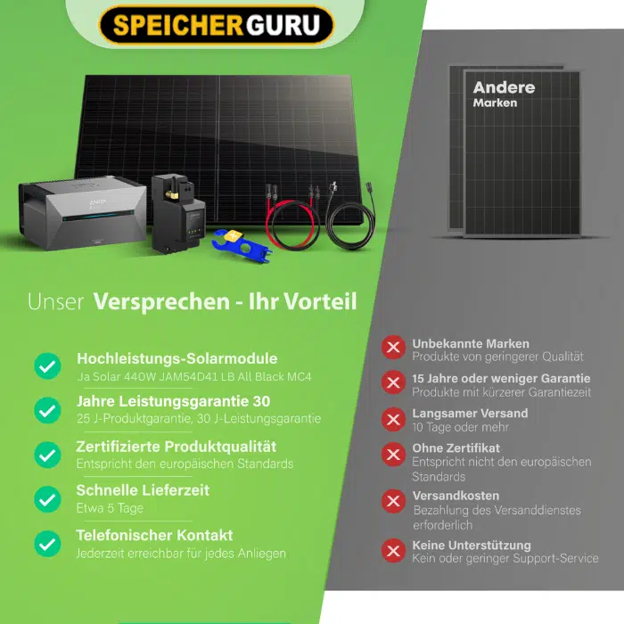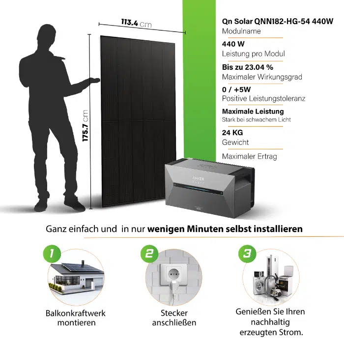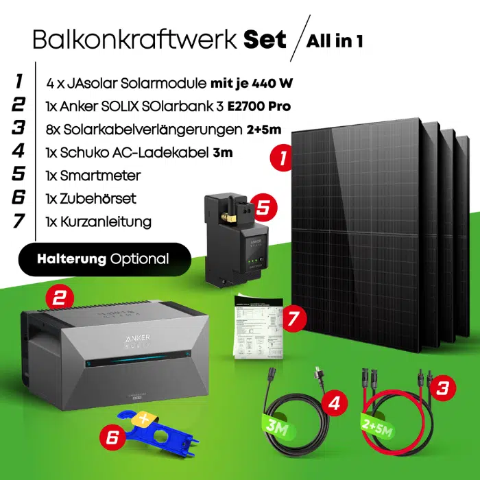 Steigen Sie um auf saubere Energie mit dem hochmodernen 1600W Balkonkraftwerk Set (1760Wp). Dieses umfassende Paket kombiniert die Effizienz von vier bifazialen JA Solar 440W Modulen mit der intelligenten Speicherkapazität der Anker SOLIX Solarbank 2 Pro und einem Smartmeter, um Ihre Stromkosten nachhaltig zu senken und Ihre Energieunabhängigkeit zu maximieren.