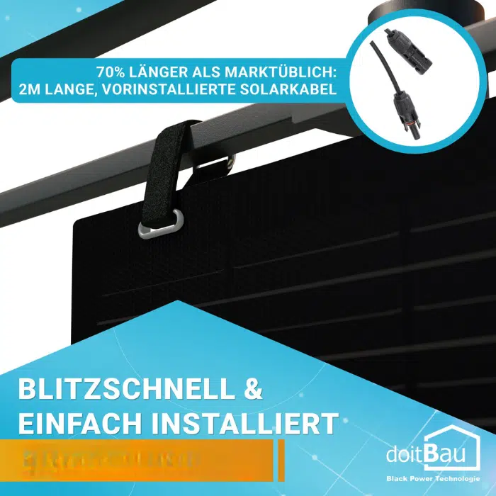 - Schnelle Installation: Vormontierte 2 m Solarkabel und acht Montage-Klettbänder ermöglichen werkzeuglose Befestigung.