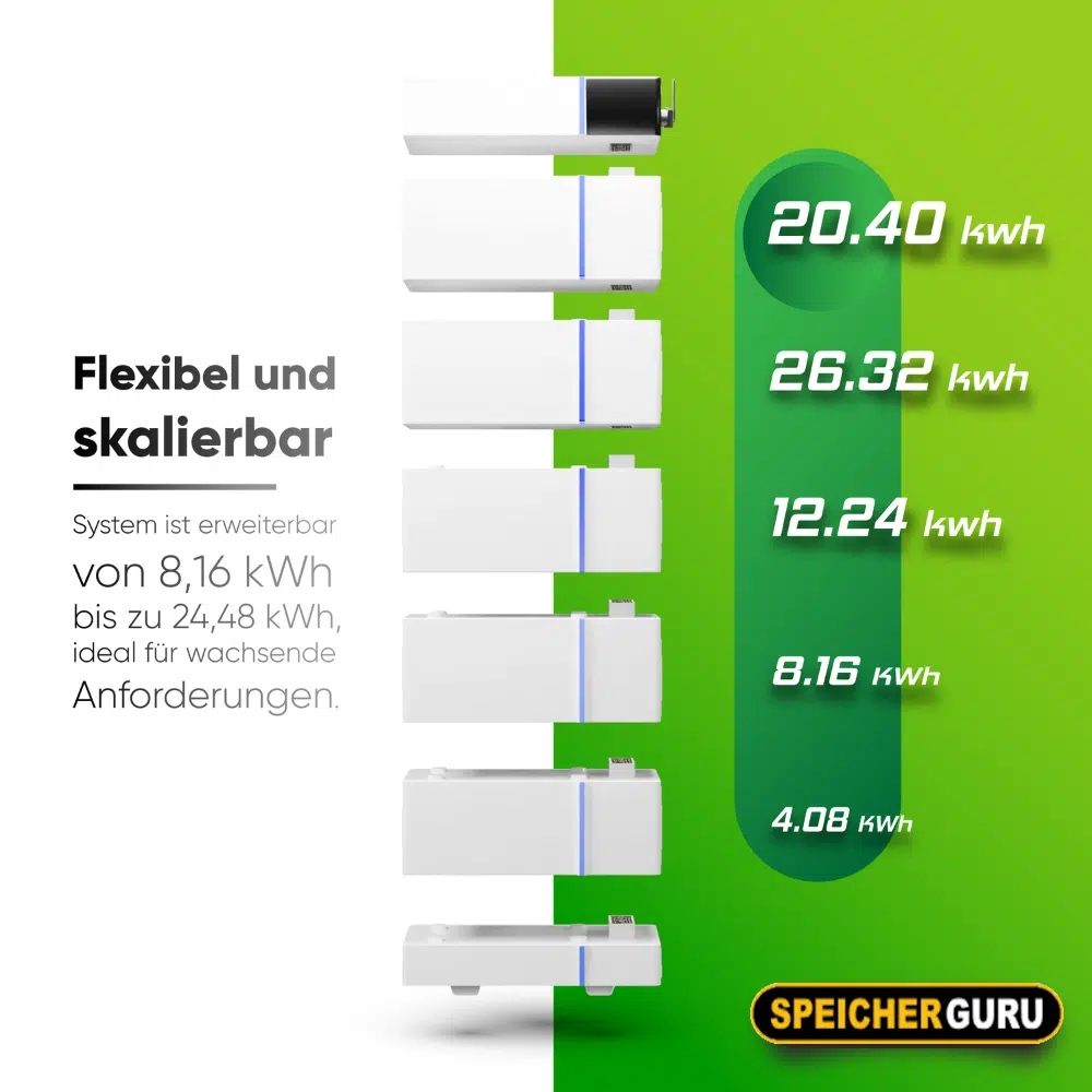 Die Deye GB-L Batteriebank zeichnet sich durch ihr einzigartiges modulares Design aus. Das Set besteht aus fünf 4,09 kWh Batteriemodulen, die in Serie verbunden werden, um die beeindruckende Systemkapazität von 20.45 kWh zu erreichen. Dieses Prinzip ermöglicht eine einfache Skalierung und Anpassung an unterschiedliche Energiebedürfnisse – von 8,18 kWh bis hin zu 24,56 kWh. So sind Sie bestens für zukünftige Erweiterungen gerüstet.