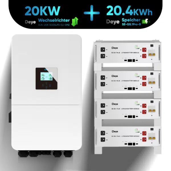 Das Deye Komplettset 20 kW vereint den innovativen SUN-20K-SG05LP3-EU-SM2 Hybridwechselrichter mit dem hochkapazitären 20,4 kWh Batteriespeicher Deye SE-G5.1 Pro-B. Dieses Set ist Ihre Komplettlösung für maximale Energieeffizienz, Unabhängigkeit und Flexibilität im Energiemanagement. Es ist ideal für anspruchsvolle private und gewerbliche Anwendungen, die auf eine nachhaltige und zuverlässige Energieversorgung setzen.