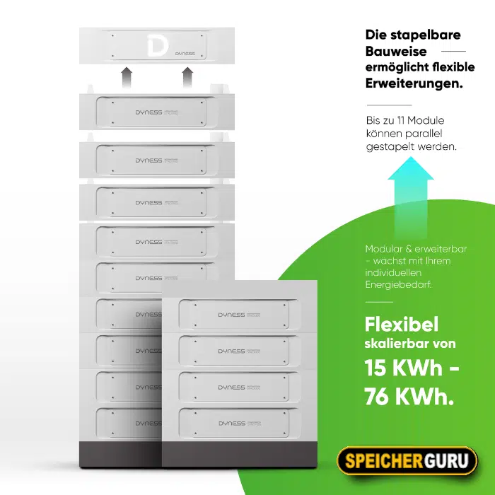 Die Systemarchitektur der Dyness Stack100 ist für professionelle Anwendungen optimiert: hohe Systemspannungen, intelligente Vernetzung, parallele Clusterbildung sowie umfassender Brandschutz und Zellüberwachung machen das System zu einer Investition in maximale Versorgungssicherheit.
