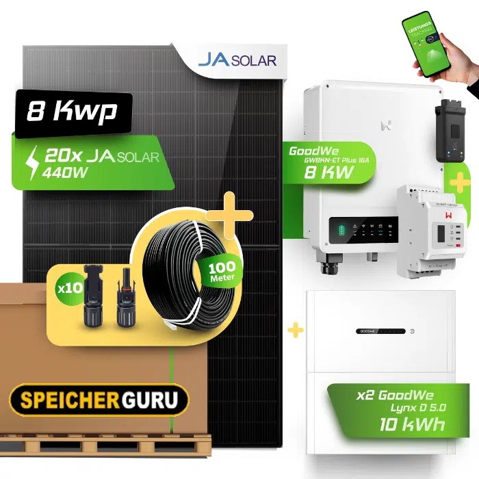 Die GoodWe Photovoltaikanlage 8,8 kW Komplettset bietet eine hochwertige und zukunftsweisende Lösung für Ihre Energieunabhängigkeit. Dieses System kombiniert 20 leistungsstarke JA Solar 440W Fullblack Solarmodule, einen effizienten GoodWe GW8KN-ET Plus 8 kW Hybrid-Wechselrichter und einen robusten GoodWe Lynx Home D 10 kWh Hochvolt-Speicher. Ideal für Eigenheimbesitzer und Unternehmen, die auf maximale Leistung, Zuverlässigkeit und einen hohen Eigenverbrauch setzen.