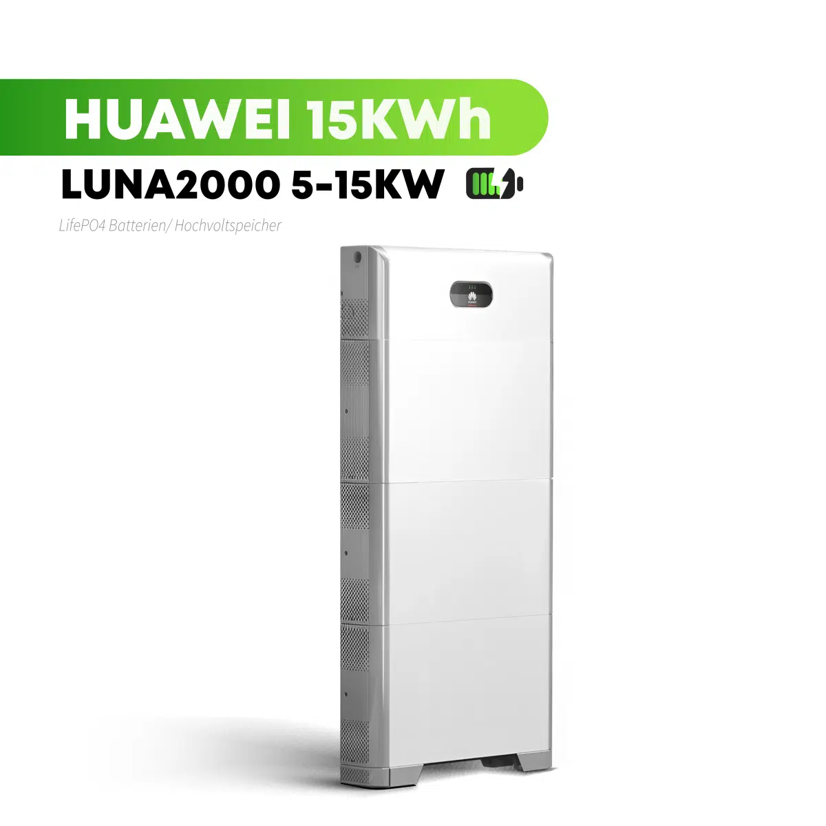 - 3 × Huawei LUNA2000-5-E0 Batteriemodule (je 5 kWh): Hocheffiziente Lithium-Eisenphosphat (LiFePO4) Zellen für Sicherheit und Langlebigkeit.