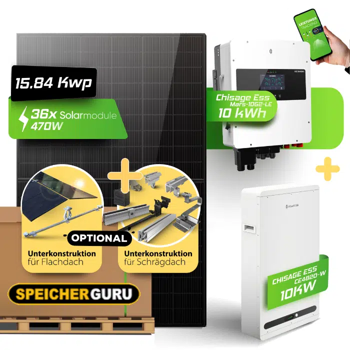 Die Speicherguru 15,84 kWp Photovoltaik-Anlage bietet eine leistungsstarke und zukunftssichere Lösung für Ihre Energiebedürfnisse. Dieses umfassende System kombiniert 36x hochwertige JA Solar 440W JAM54D41 Glas-Glas-Module mit dem fortschrittlichen Chisage ESS Mars-14G2-LE Hybrid-Wechselrichter, um eine maximale Eigenstromnutzung und hohe Autarkie zu gewährleisten.