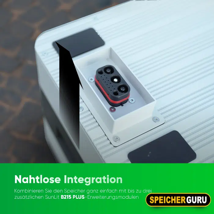 Das modulare Design des BK215 ermöglicht eine einfache Kapazitätserweiterung mit bis zu drei SunLit B215 Akkumodulen. So lässt sich die Gesamtkapazität auf beeindruckende 8,6 kWh erhöhen – perfekt für wachsende Energiebedarfe oder zukünftige PV-Erweiterungen. Die Verbindung erfolgt werkzeuglos über praktische Plug-and-Play-Steckverbindungen.