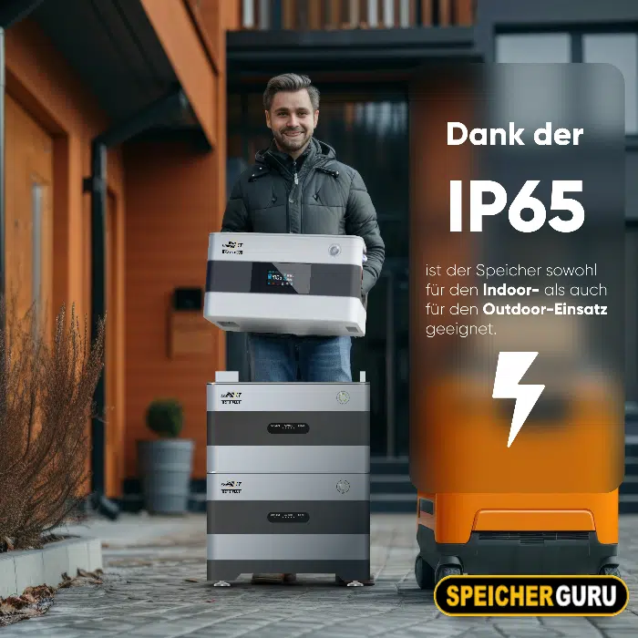 Der hochwertige LFP-Akku (LiFePO4) garantiert eine lange Zykluslebensdauer von über 8000 Ladezyklen (20–80 % DoD). Das wetterfeste IP65-Gehäuse, eine integrierte Heizfunktion und das fortschrittliche Batteriemanagementsystem (BMS) ermöglichen den ganzjährigen Betrieb im Innen- und Außenbereich – selbst bei extremen Temperaturen von -20 °C bis +40 °C.
